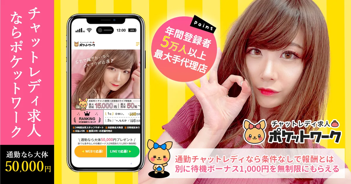 でも、チャットレディって聞くと、「なんだか怪しそう」「本当に稼げるの?」「顔バレしたらどうしよう…」と、不安がたくさんありますよね。私も最初は不安でいっぱいでした。 そんな私が勇気を出して登録してみたのが、全国各地に展開している大手のチャットレディ事務所「ポケットワーク」です。